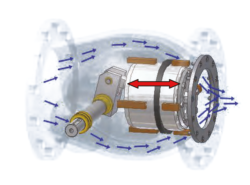 شدت جریان (دبی) آب در یک فضایی حلقوی در داخل بدنه شیر و در سرتاسر آن به گونهای پر بازده مورد کنترل و هدایت واقع میشود. سطوح مقاطع این فضا بطور پیوسته از ورودی شیر تا خروجی (گلویی و ناحیه کنترل دبی) کاهش مییابد. این عوامل و پیوستگی باعث افزایش سرعت جریان و کاهش فشارمیشود.