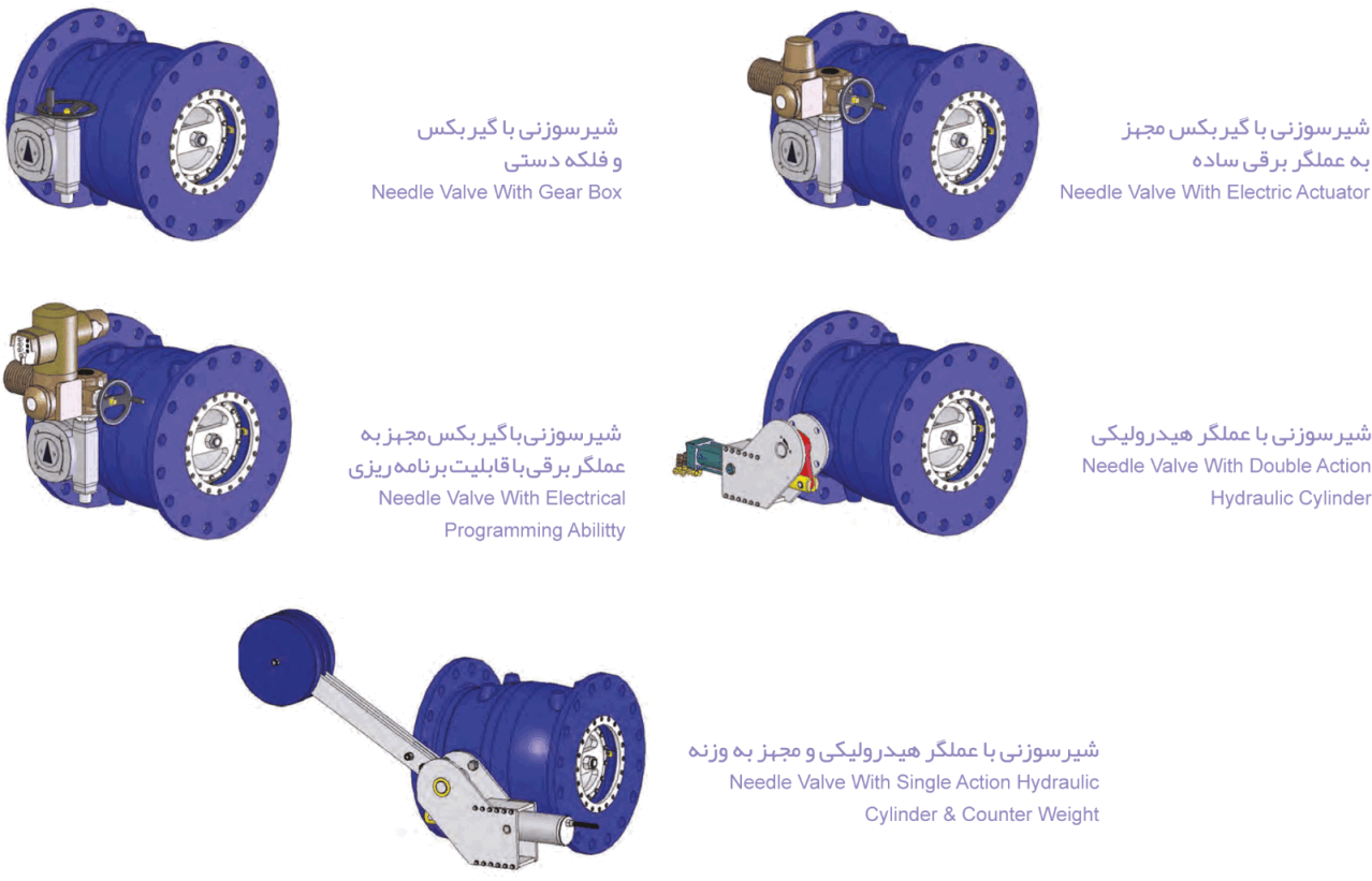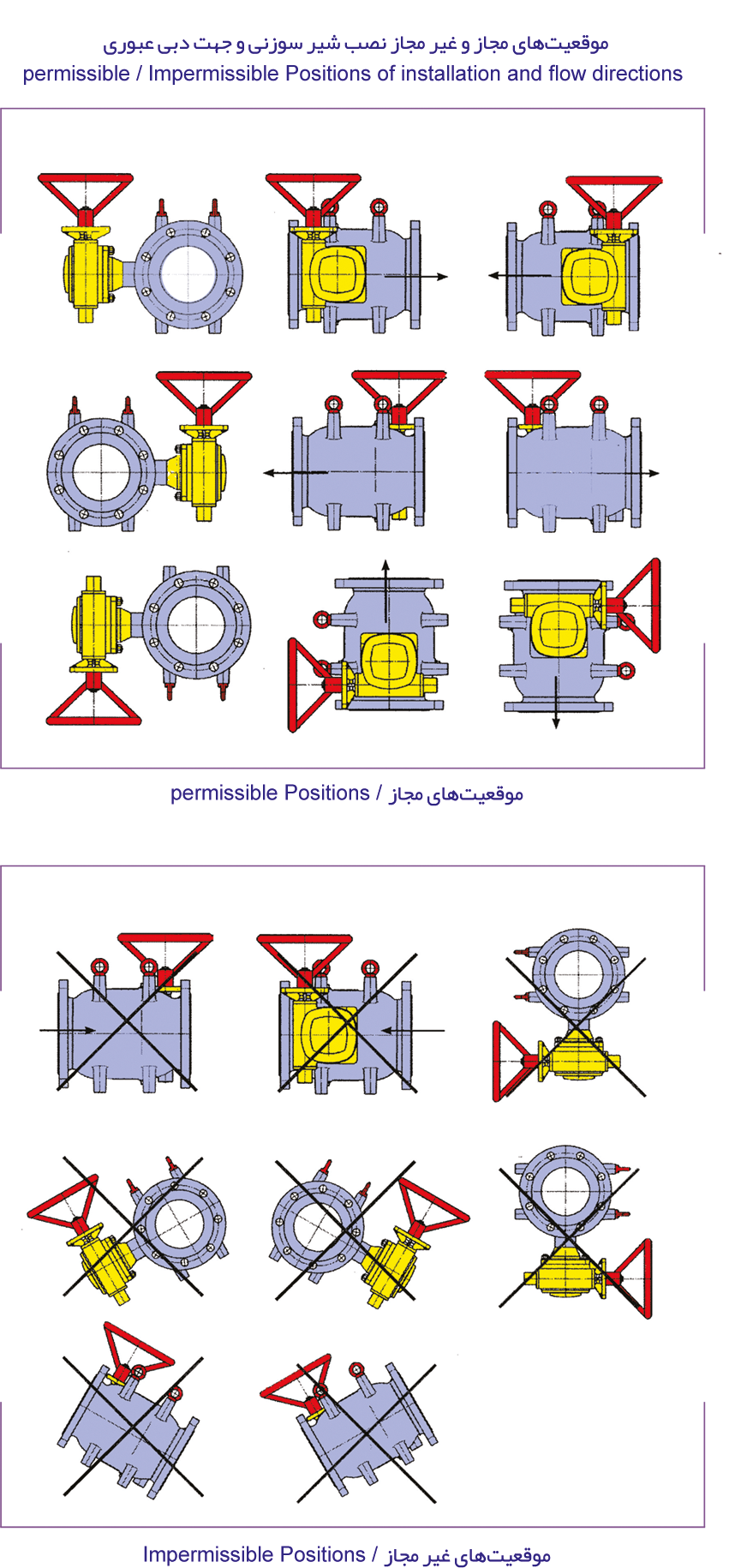 شیرهای سوزنی فقط می توانند در دو وضعیت عمودی ویا افقی نصب و مورد بهره برداری واقع شوند. لذا در سایر وضعیت ها نمی توانند مورد بهره برداری قرار گیرند. جهت عبور و گذر دبی توسط فلش قابل مشاهده است، لذا به علامت فلش روی بدنه شیر که جهت عملکرد و بهره برداری شیر است توجه فرمایید.