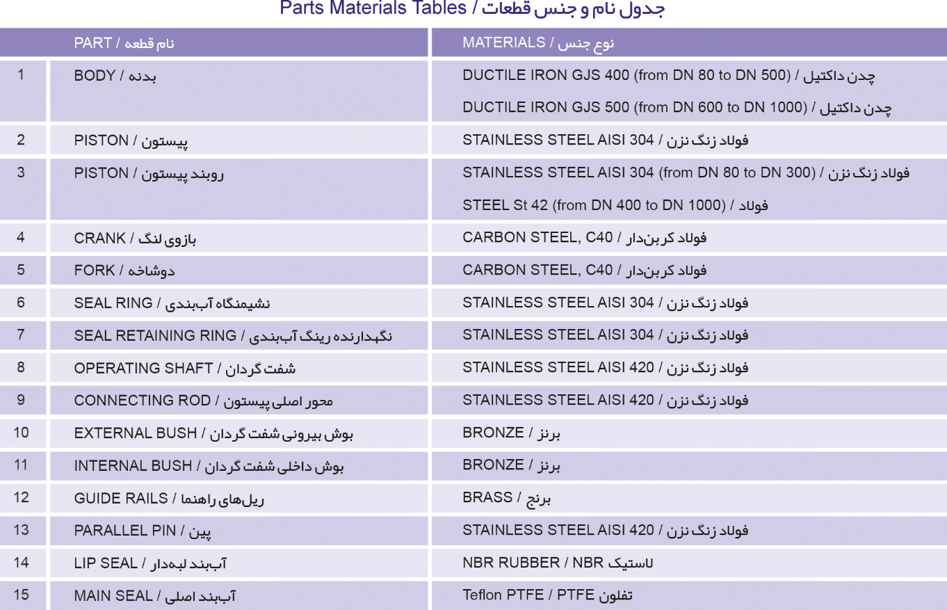 پیستون به هنگام حرکت طولی خود بطور کامل توسط ریلهای بلند که از برنز ساخته شدهاند، با تضمین حداقل اصطکاک و کمترین اثرات رسوب گذاری هدایت میشود و در تمام شرایط کاری کاملا توانمند و با استحکام میباشند. نشیمنگاه آببندی شیر از رینگ فولادی که از قابلیت تعویض آسان برخوردار میباشد ساخته شده است. آب بند اصلی شیر که از تفلون مقام (PTFE) ساخته شده است به گونهای محافظت شده نصب و قابل تعویض میباشد. این قطعه در یک رینگ فولادی ضد زنگ جاگذاری و ترکیب قطعاتی از جنسهایی شامل : فولاد ضد زنگ تفلون شده است. بنابراین این ناحیه آببندی محافظت شده، از آمیزهها ضد زنگ تشکیل شده است.