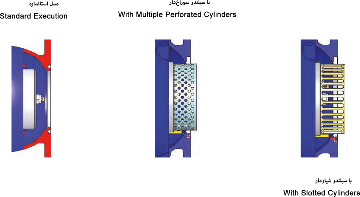 سیلندرهای سوراخ دار و شیاردار استاندارد که با کدهای K20-K50-K100-K150 معرفی میشوند، ویژگی و خصوصیات مقاومتی شیر را در برابر کاویتاسیون و افزایش متوالی نیروها و بارهای خسارتی وارده به آن را ارتقا می دهند.